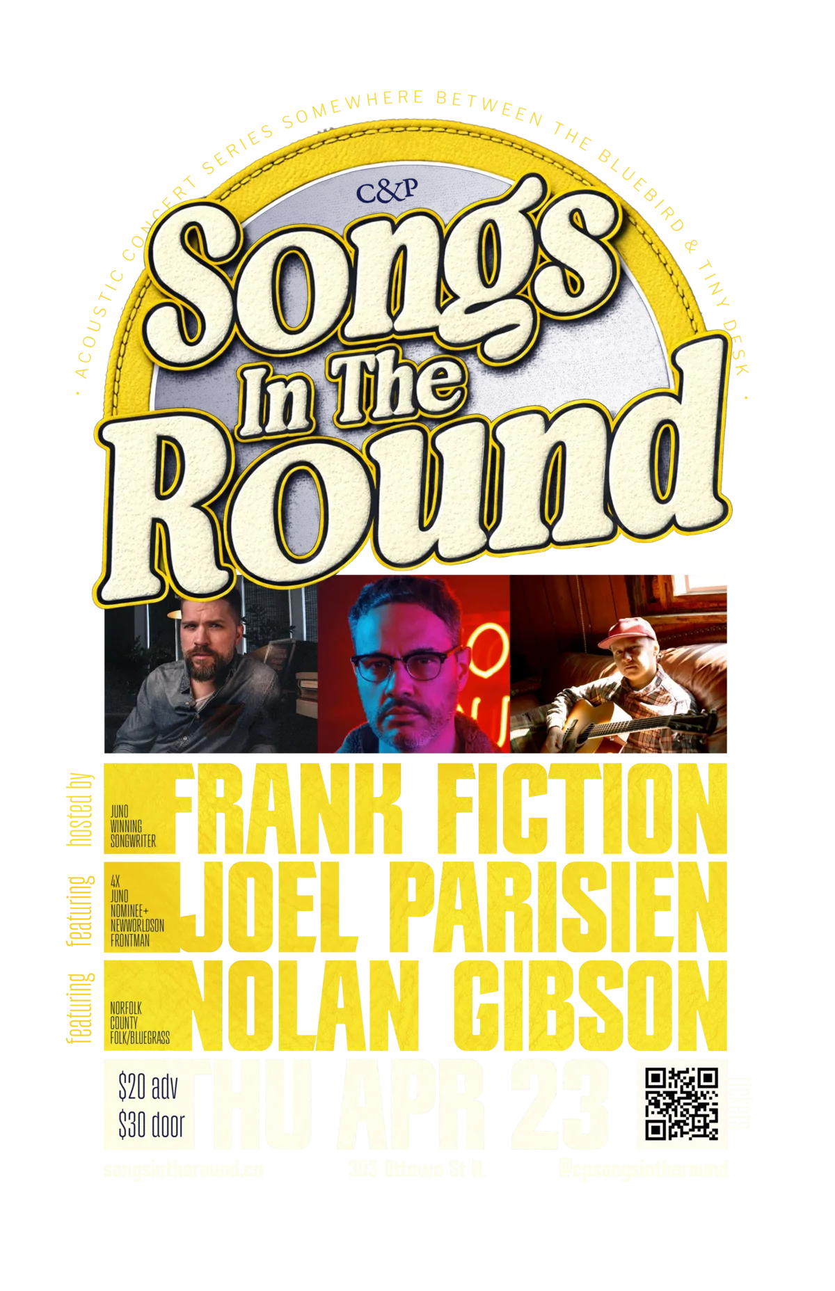 This month, Frank Fiction is joined by Joel Parisien—a 4X Juno Nominee with 3 top-five Billboard Singles and frontman of NewworldSon alongside Norfolk County soul and bluegrass songwriter Nolan Gibson. Together, they’ll share the stage, trading stories and stripping down their songs in an intimate, collaborative circle.